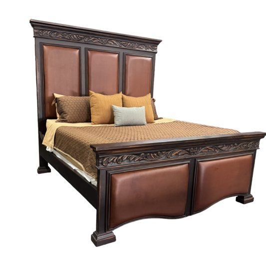 Valor Bed 87" Tall Carved Wood Bedframe | Leather Upholstered Headboard and Footboard