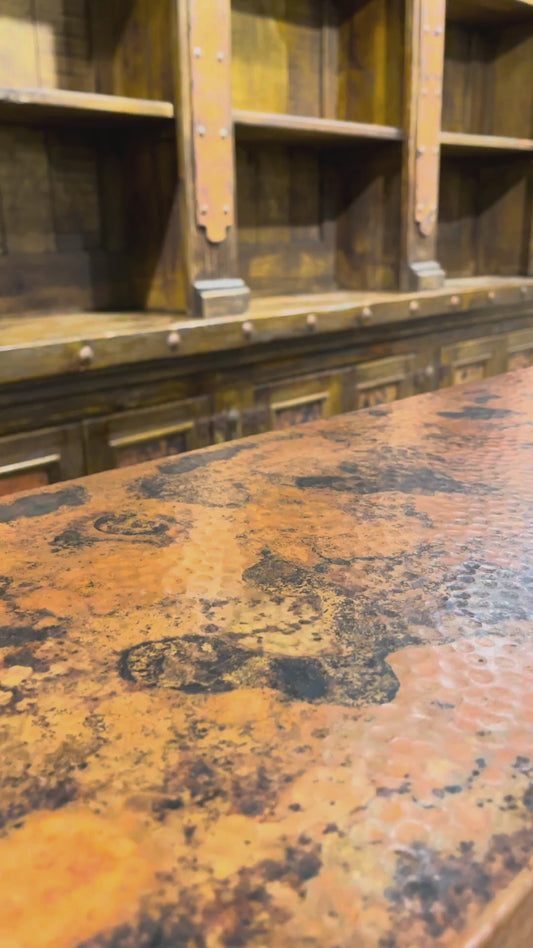 Sunset Ridge Copper 2-Piece Bar & Hutch Set | 12 ft wide | Hand-Carved | Iron Nailhead Trim & Foot Rail