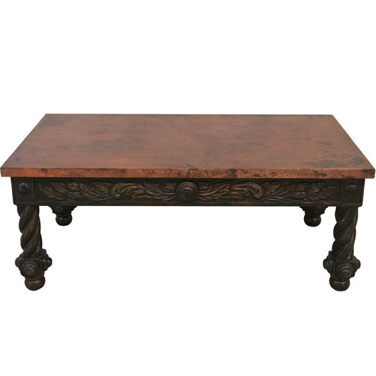 The Spaniard | Rustic Elegance Copper-Top Coffee Table with Hand-Carved Base | 22 x 28 x 55