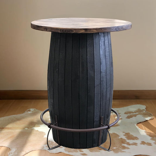 Whiskey Barrel Pub Table – Charred Black Base with Rustic Wood Top