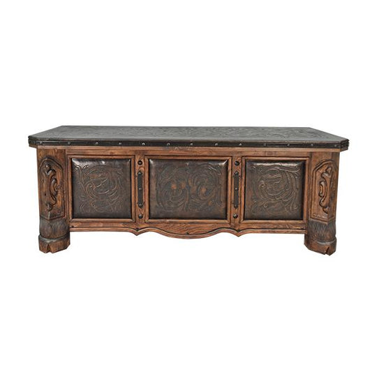 Whisper Ridge Executive Desk | Hand-Carved Solid Wood, Tooled Leather Top and Panels