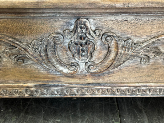 AURELIAN BED 87" Tall | Carved Headboard with Tufted Tan Fabric | Rustic Distressed Finish | Brown Wood | Bed Only | Includes Delivery and Assembly