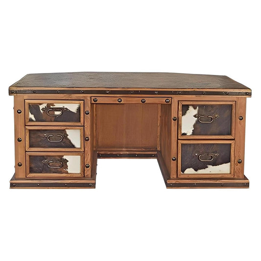 Brazos Executive Desk | Solid Wood with Cowhide Panels & Iron Trim