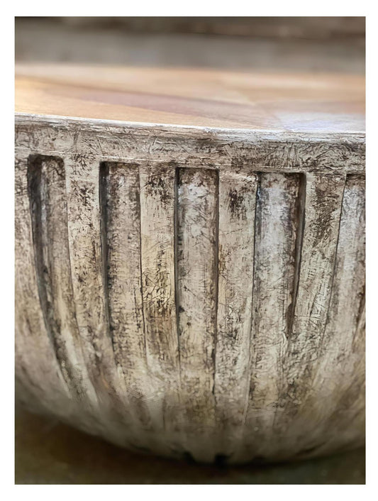 Cirq-Lapopie Coffee Table - Round, Weathered Gray, Ribbed Exterior Texture, Distressed Concrete Finish