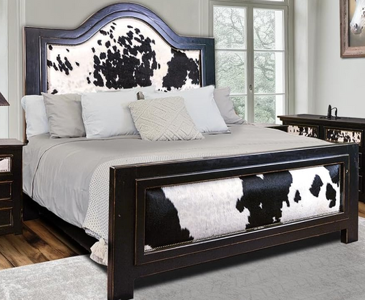 Pioneer Trail Bed with Black & White Genuine Cowhide Inlays in the Footboard and Tall Headboard | Handcrafted | Bed Only | Delivery & Assembly are Included