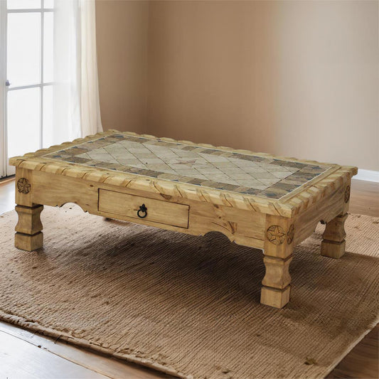 Rustic Pueblo Coffee Table with Inlaid Tile Top & Storage Drawer | 20 x 32 x 50
