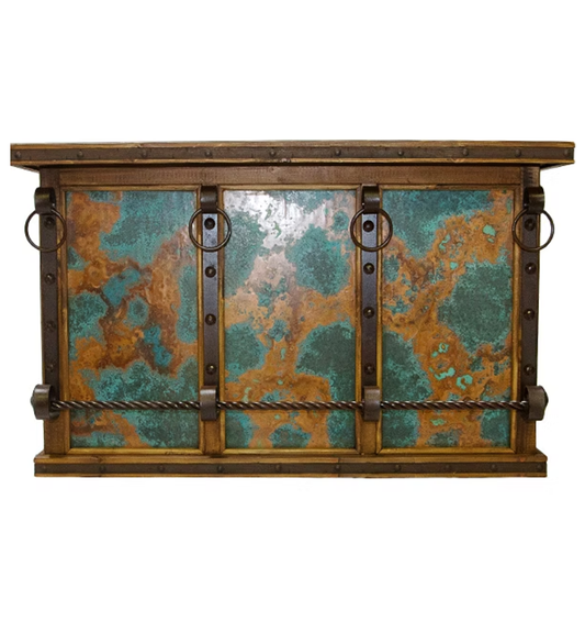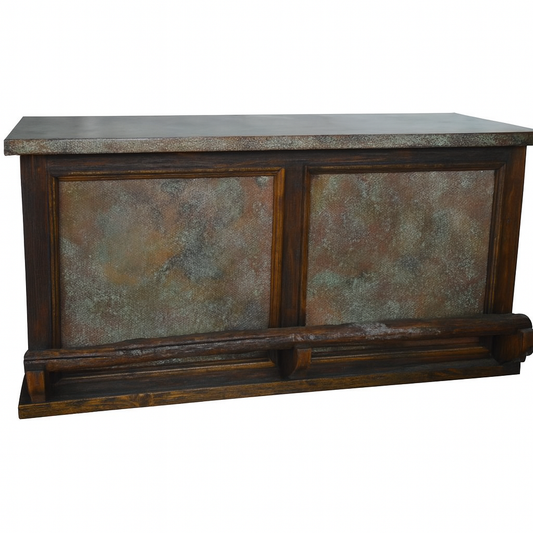 Desert Wind Rustic Home Wooden Bar with Verdi-Gris Copper Panels, Copper Top, & Log Footrail
