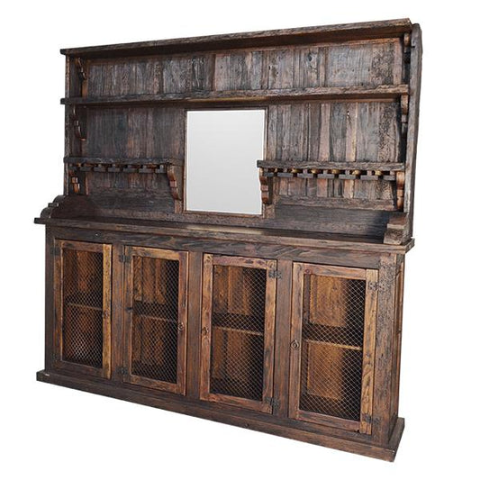 Old West Rustic Bar Back Hutch with Wine Glass Storage & Display Shelves, Hand-Carved