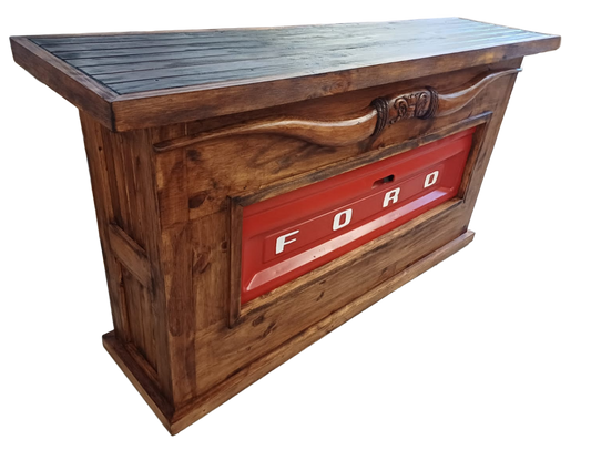 Motor City Wooden Home Bar with Hand-Carved Bull Horns and Built-in Ford Truck Tailgate 76"x24"x42", Rustic, Western