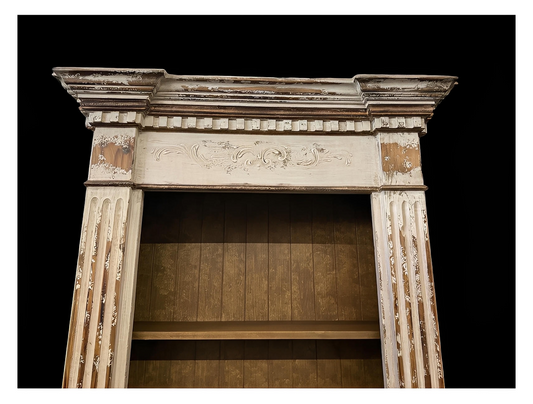 Chinon Bookcase, Distressed White, Mantel Style With Carved Details And Fluted Pillars