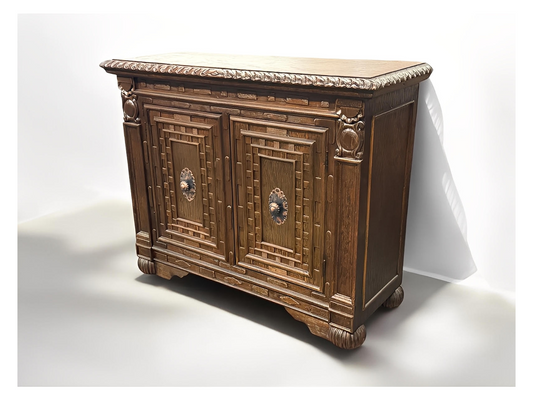 Luynes Chest, Dark Walnut Finish, Antique Brass Hardware, Carved Paneled Doors, Ball Feet