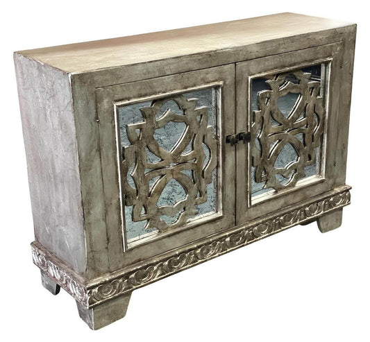Lourmarin Chest, Silver, Distressed Mirrored Panels With Ornate Fretwork Doors, Antique Finish
