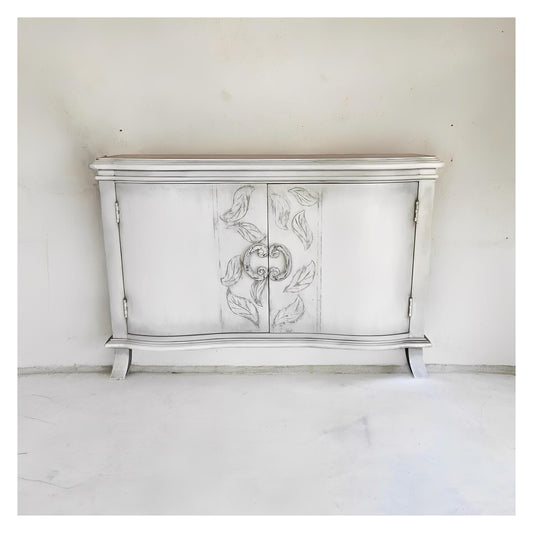 La Turbie Chest, Distressed White Finish, Hand Painted Leaf Motif On Doors, Ornate Ring Pull Hardware