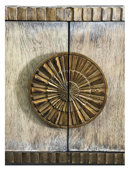 Gordes Chest, Brown Distressed Walnut, Circular Brass Sunburst Medallion Hardware With Aged Finish