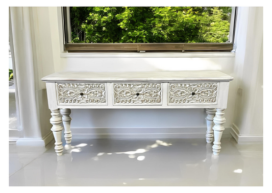 Saint-Léon Console Table, Whitewashed Distressed Finish, Three Ornate Carved Drawers