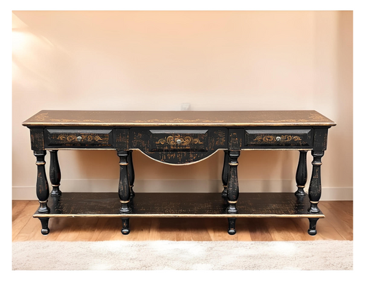 Saint-Émilion Console Table, Distressed Black Finish With Antique Gold Floral Accents, Two Tier Design