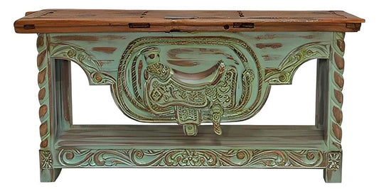 Tascosa Canyon Hand Carved Saddle Stand With An Old Door Top Credenza / Console Table - Teal