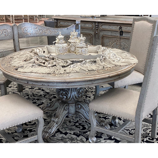 Authentic Rustic Western dining chairs featuring tooled leather, genuine cowhide, and hand-carved wood craftsmanship for timeless Southwestern style.