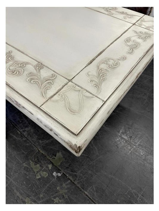 Usson Dining Table - Rectangular, Weathered Whitewash, Ornate Carved Trestle Base