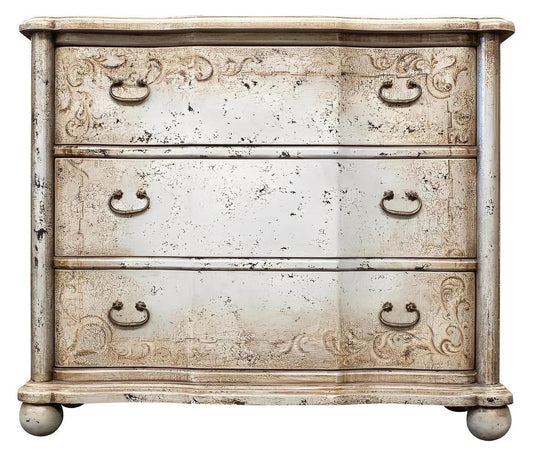 Alessandra Dresser, Distressed Whitewashed Gray, Hand-Carved Floral Scrollwork On Front Drawers
