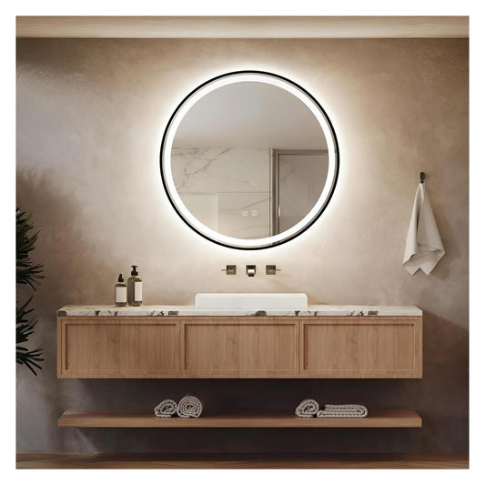 Framed Round LED Bathroom Vanity Mirror - Adjustable Brightness and Color Temperature - Anti-Fog