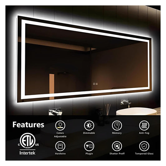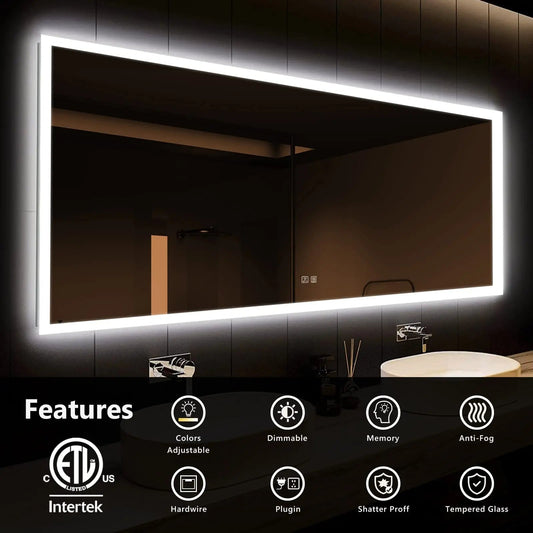 Edge Glow LED Bathroom Mirror (50+ in) - Adjustable Brightness and Color Temperature - Anti-Fog