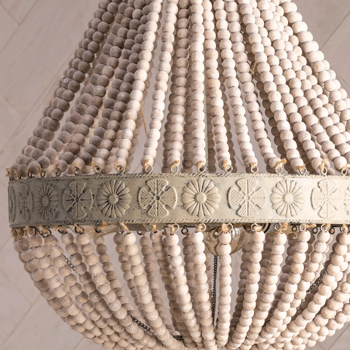 Dimensions: 24 x 19.25 x 15.75 (in). Pearls and antiqued metal form the style of the Crestview Collection Andrea Chandelier. This rustic style lamp holds three bulbs for ample illumination through the hundreds of draped pearl-finished beads both above and below the stamped metal frame. Your home adds tons of personality with this chandelier hanging from above, looking both antique and strikingly modern at the same time.