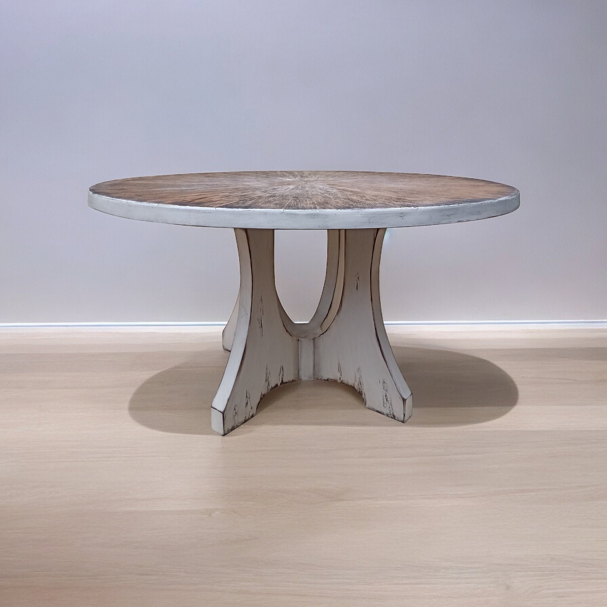 - 60" round tabletop with a weathered white finish and visible wood grain