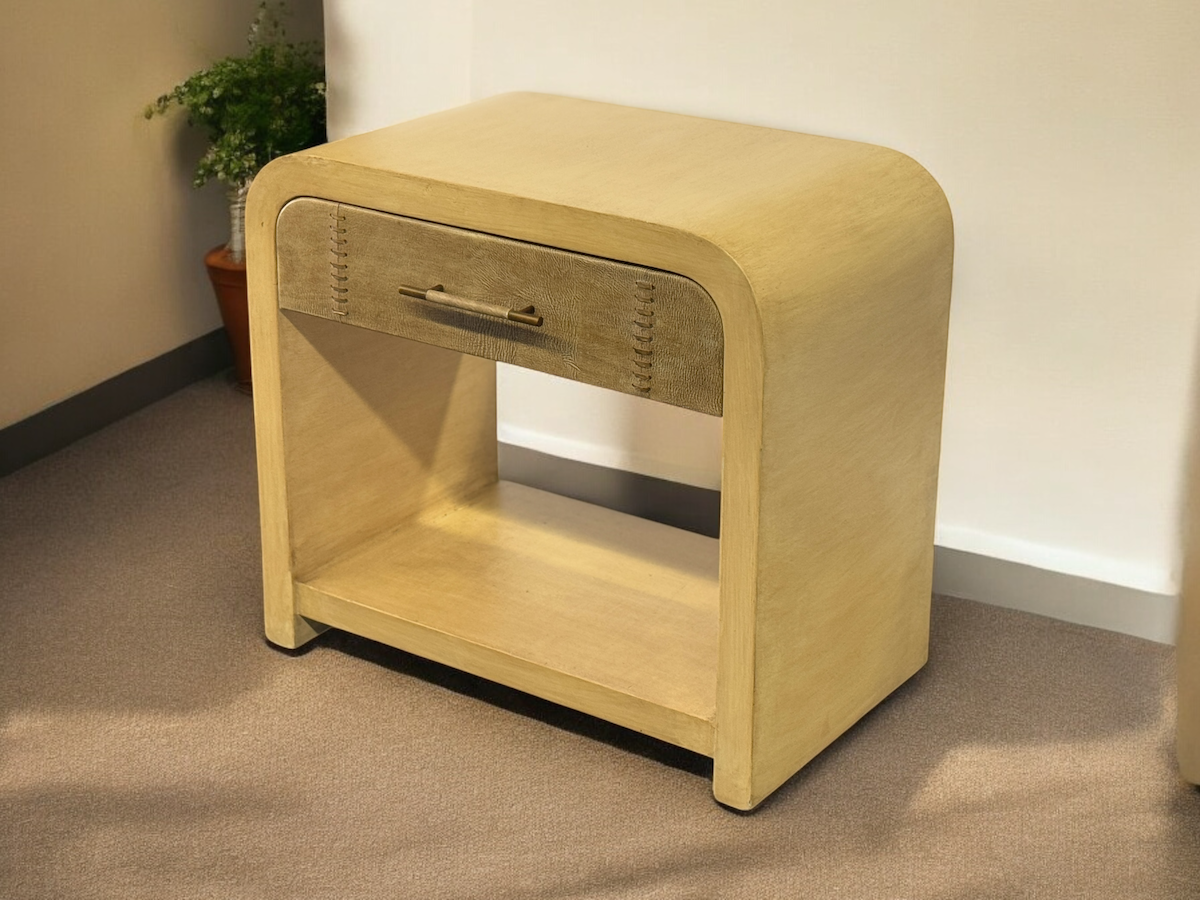 - One drawer with a slim brass-tone pull and an open lower shelf for convenient bedside storage.