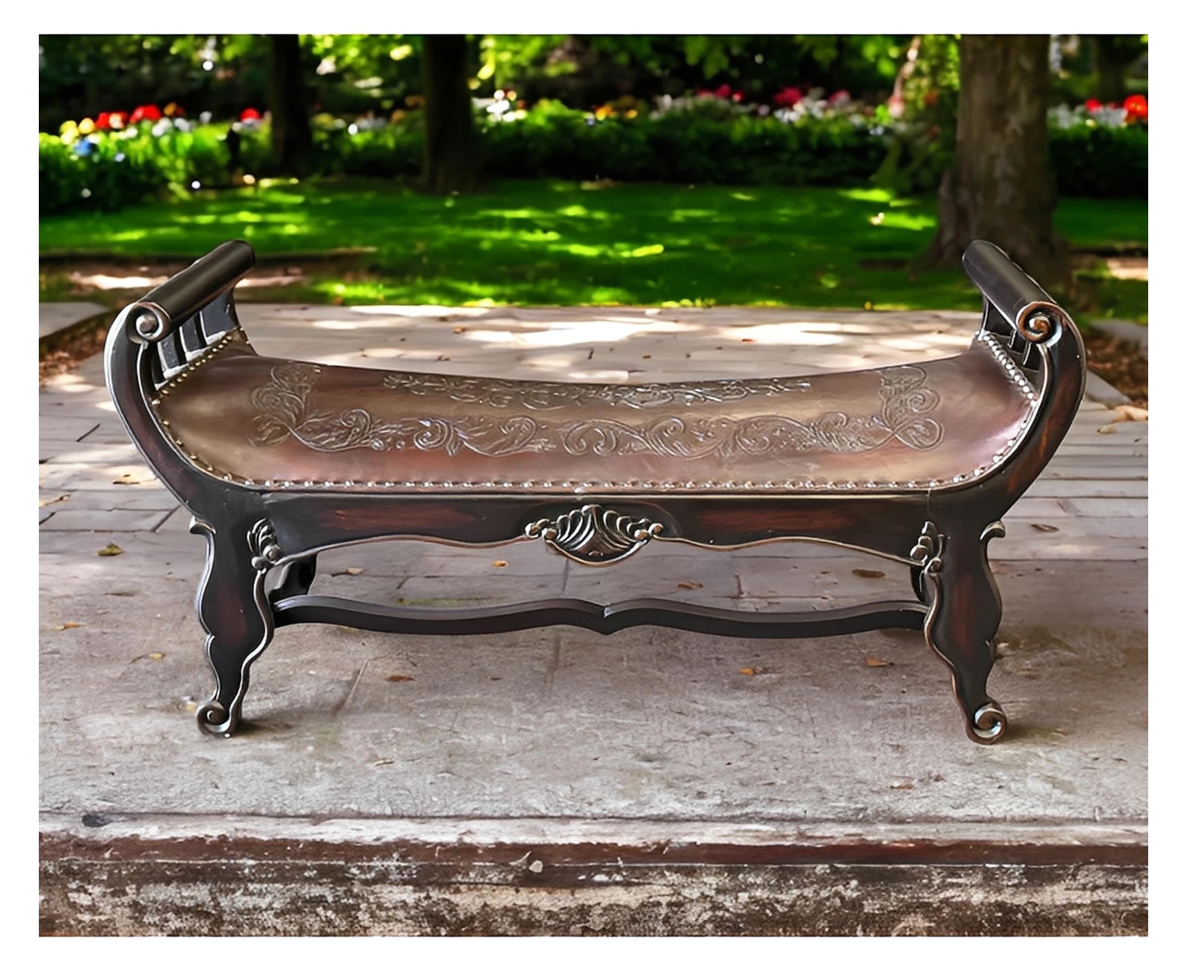 Blois Bench, Dark Brown Leather Upholstered Seat With Handcrafted Floral Tooling, Ornate Wood Frame