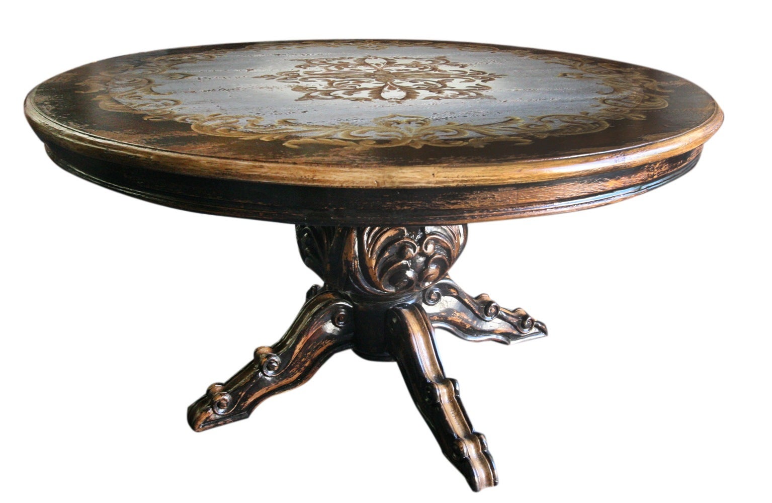 Castelnou Dining Table - Round, Dark Walnut, Antique Gold Floral Inlay on a carved pedestal base