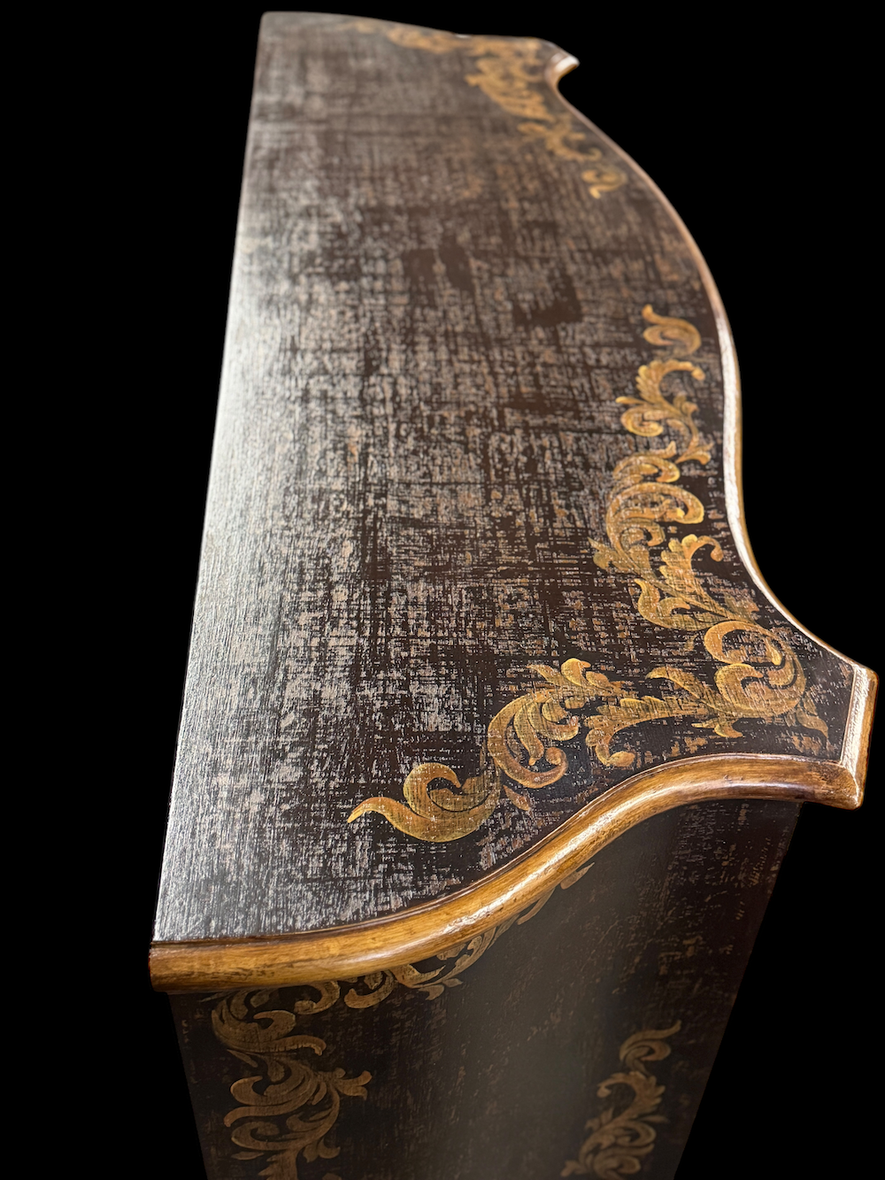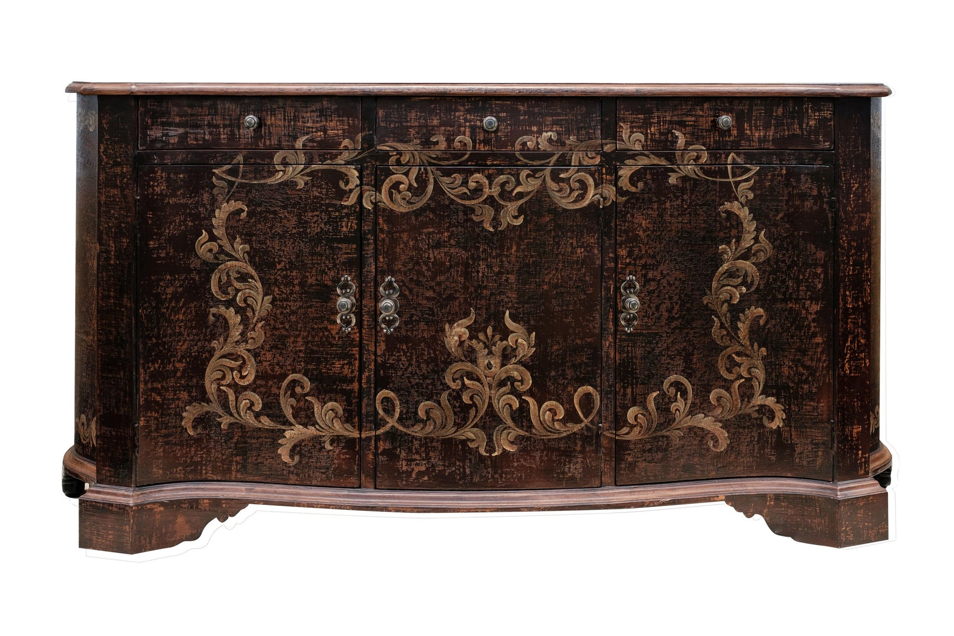 Features Ebony finish accented by gilded floral scrollwork across the front for a luxurious, time-honored look. Curved, console-style silhouette with decorative molding and a wide top surface for serving or display. Stately hardware with an antique patina that complements the overall old-world aesthetic. Generous cabinet space behind doors provides concealed storage for dinnerware, linens, and barware. Solid construction and refined craftsmanship designed to endure through everyday use and special occasions.