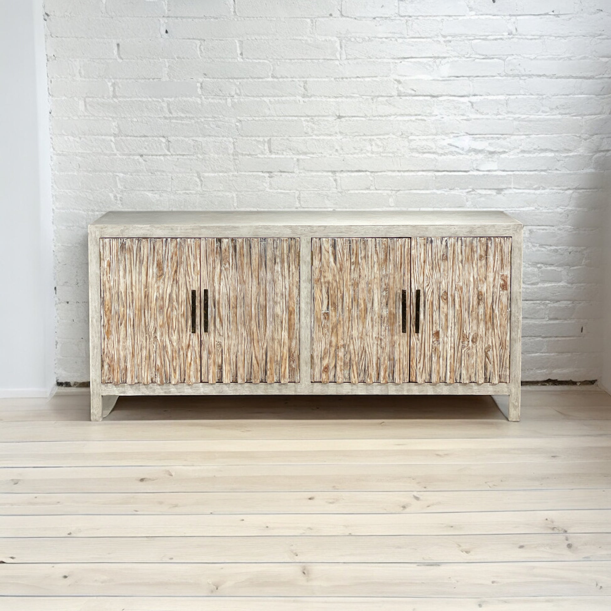 Measuring 78 inches wide, 18 inches deep, and 36 inches high, it provides generous surface area for serving and display, while two doors conceal storage for tableware and linens behind discreet dark metal pulls. The piece is handmade in the European tradition, delivering durable construction designed for daily use and lasting beauty.