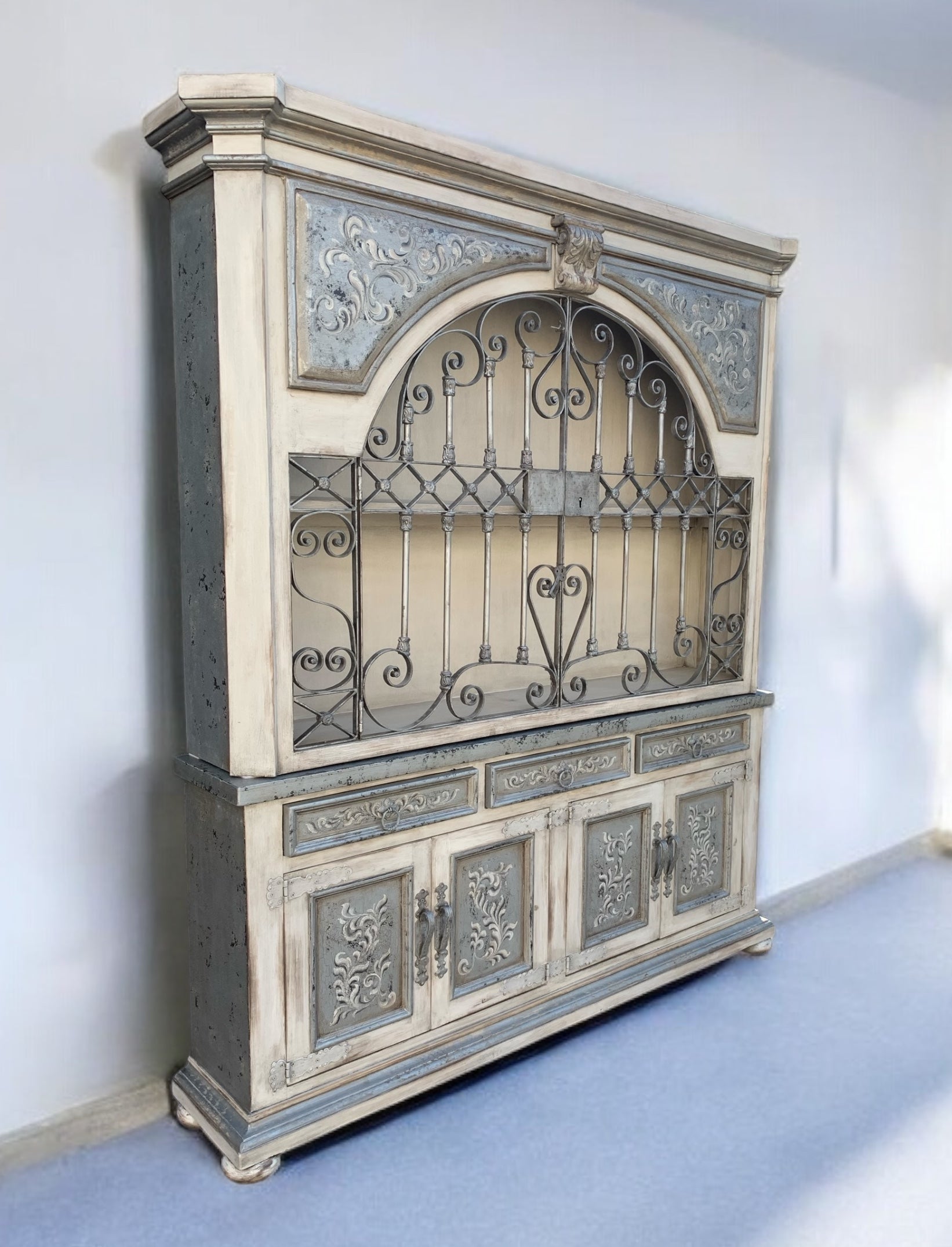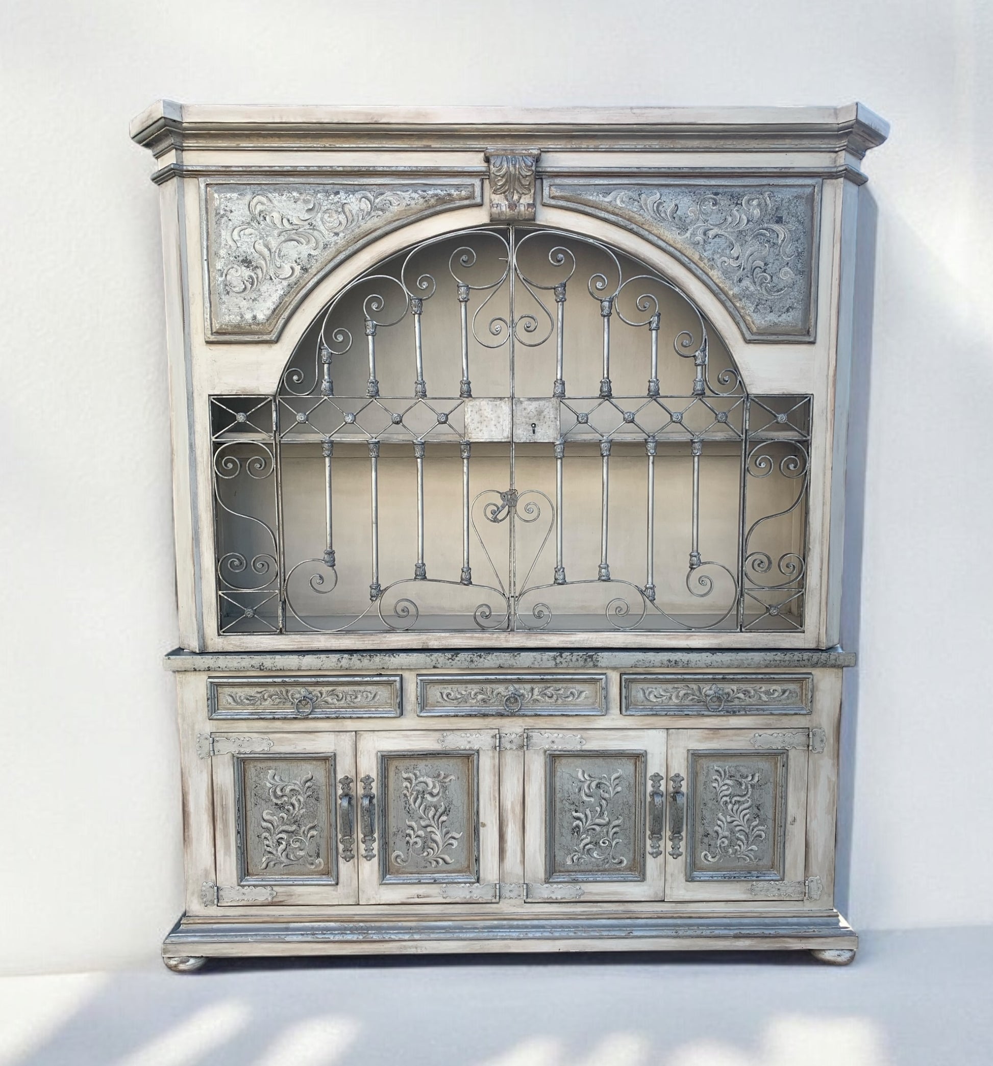 - Arched display area accented by a decorative wrought-iron grille for classic elegance.