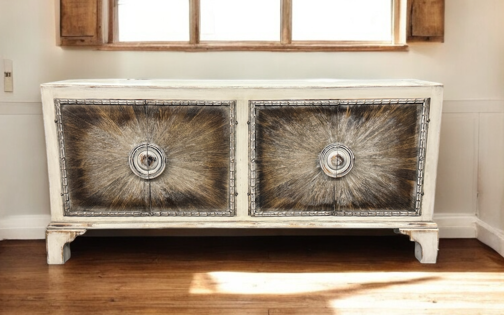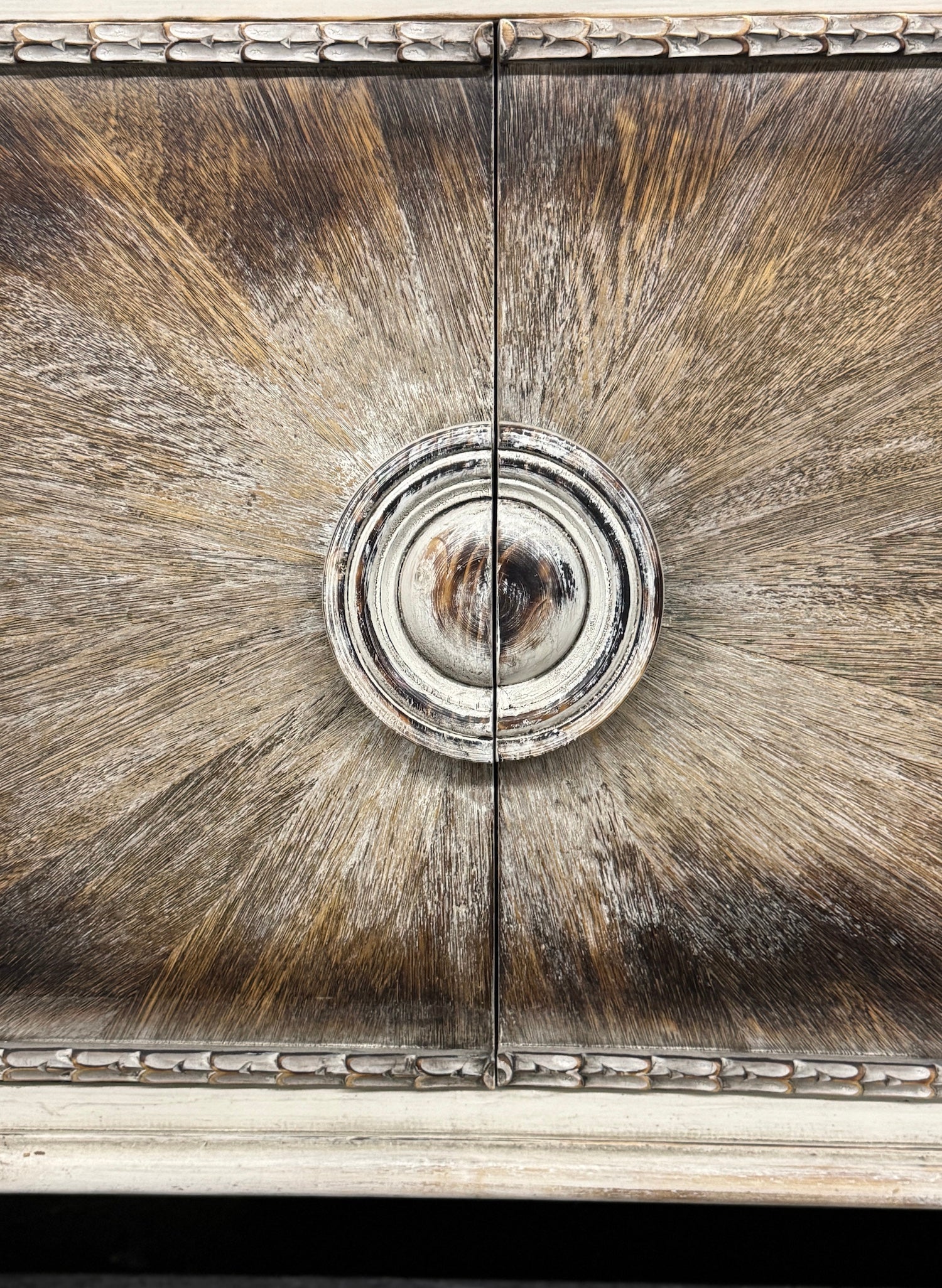 - Two front cabinet doors with round metal pulls and a sunburst-inspired paneling detail