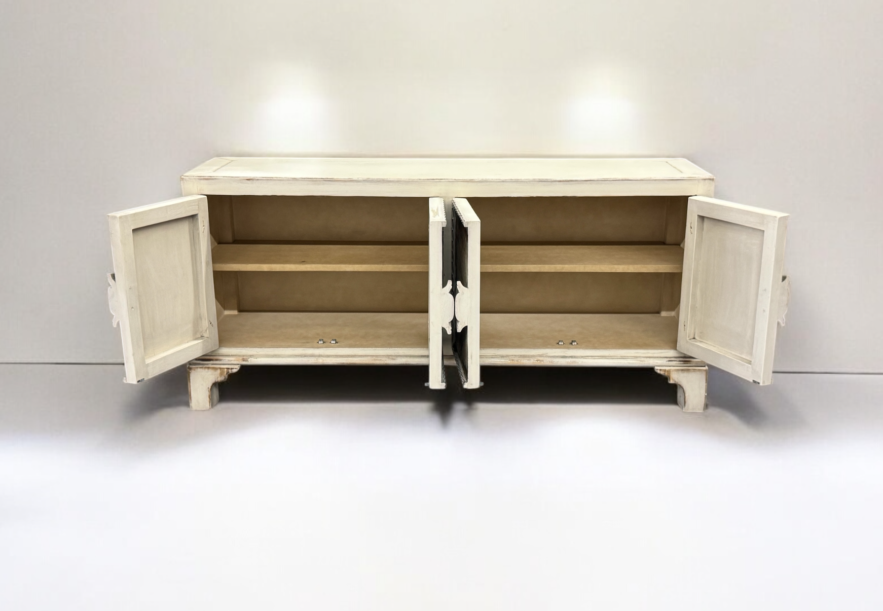 Designed as a versatile centerpiece, this buffet table provides an elegant platform for entertaining guests, showcasing dinnerware, and organizing serving pieces in style. The antique ivory finish creates a warm backdrop that complements a wide range of decors, from classic to contemporary rustic. Its thoughtfully proportioned silhouette and handcrafted details elevate your dining area while delivering dependable, everyday practicality.