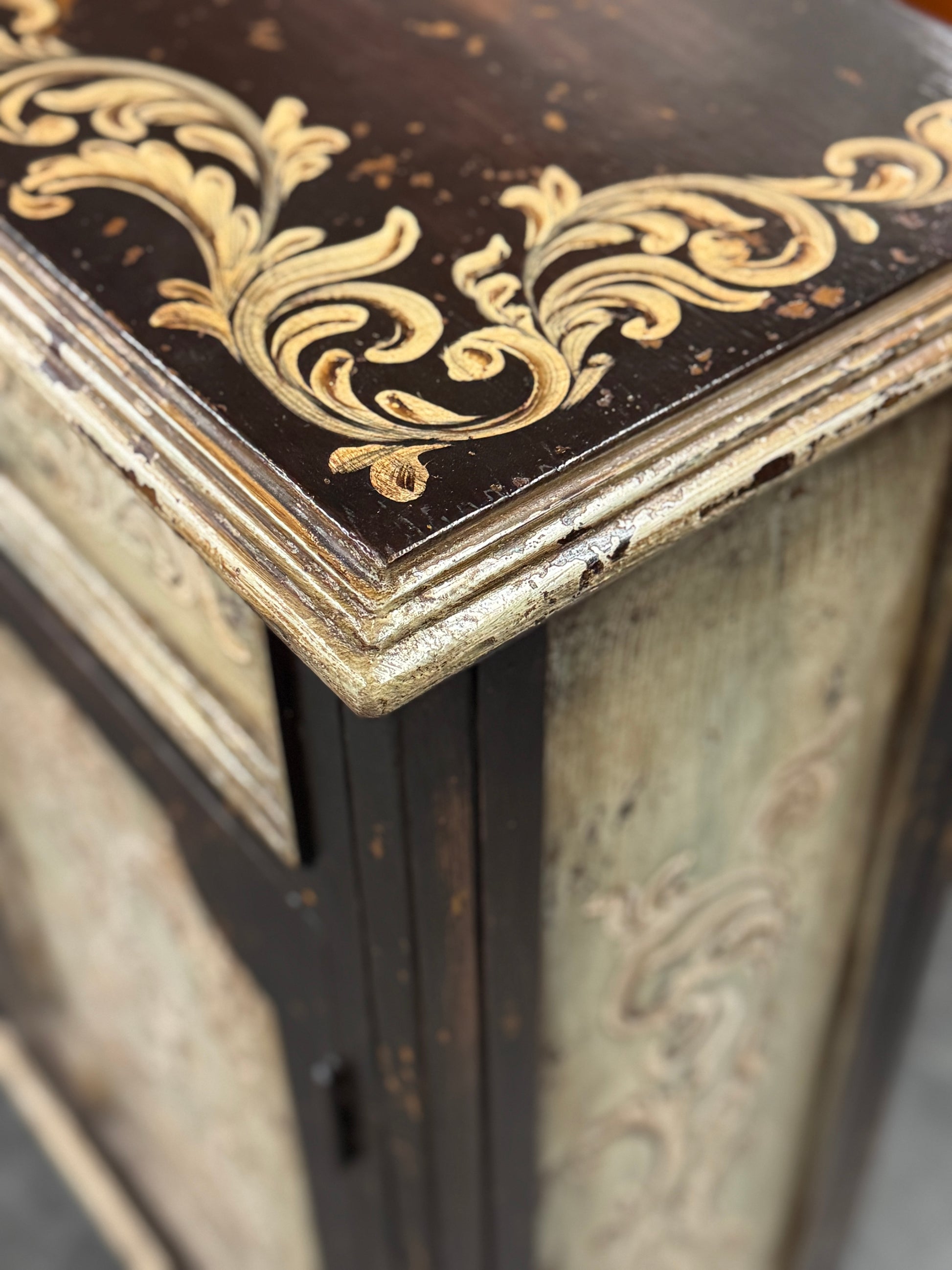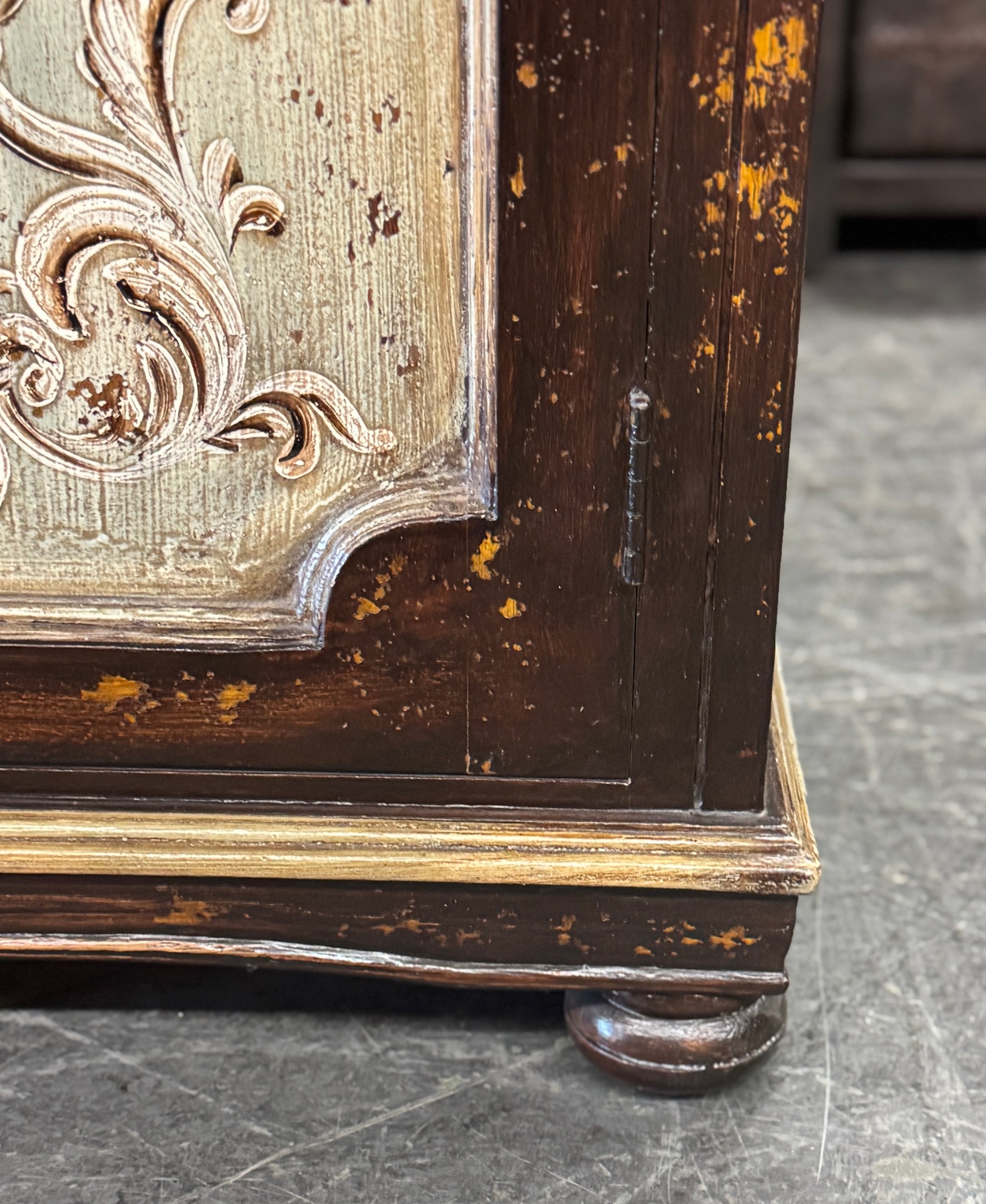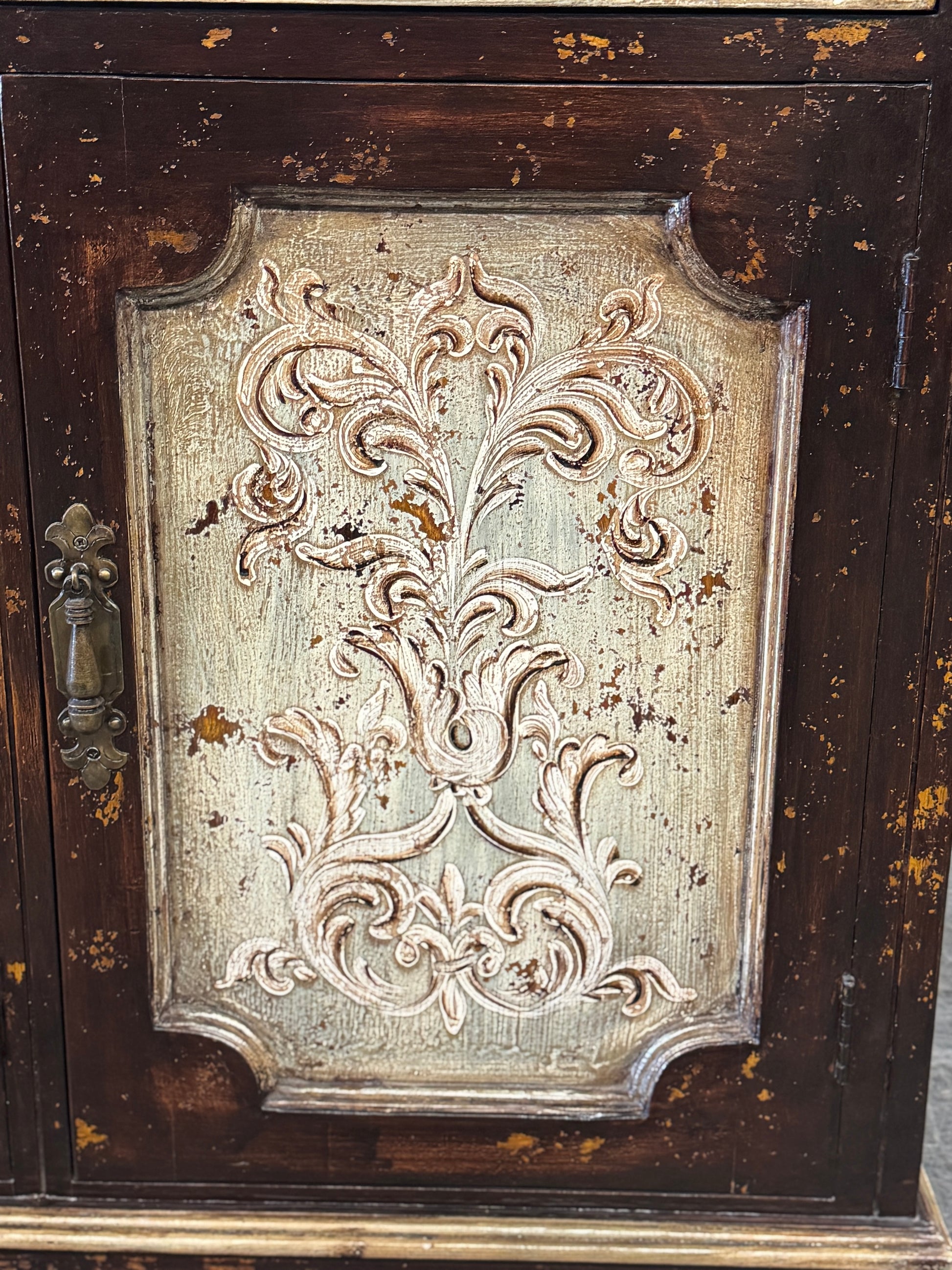 - Decorative carved front panel with intricate scroll motifs for antique charm