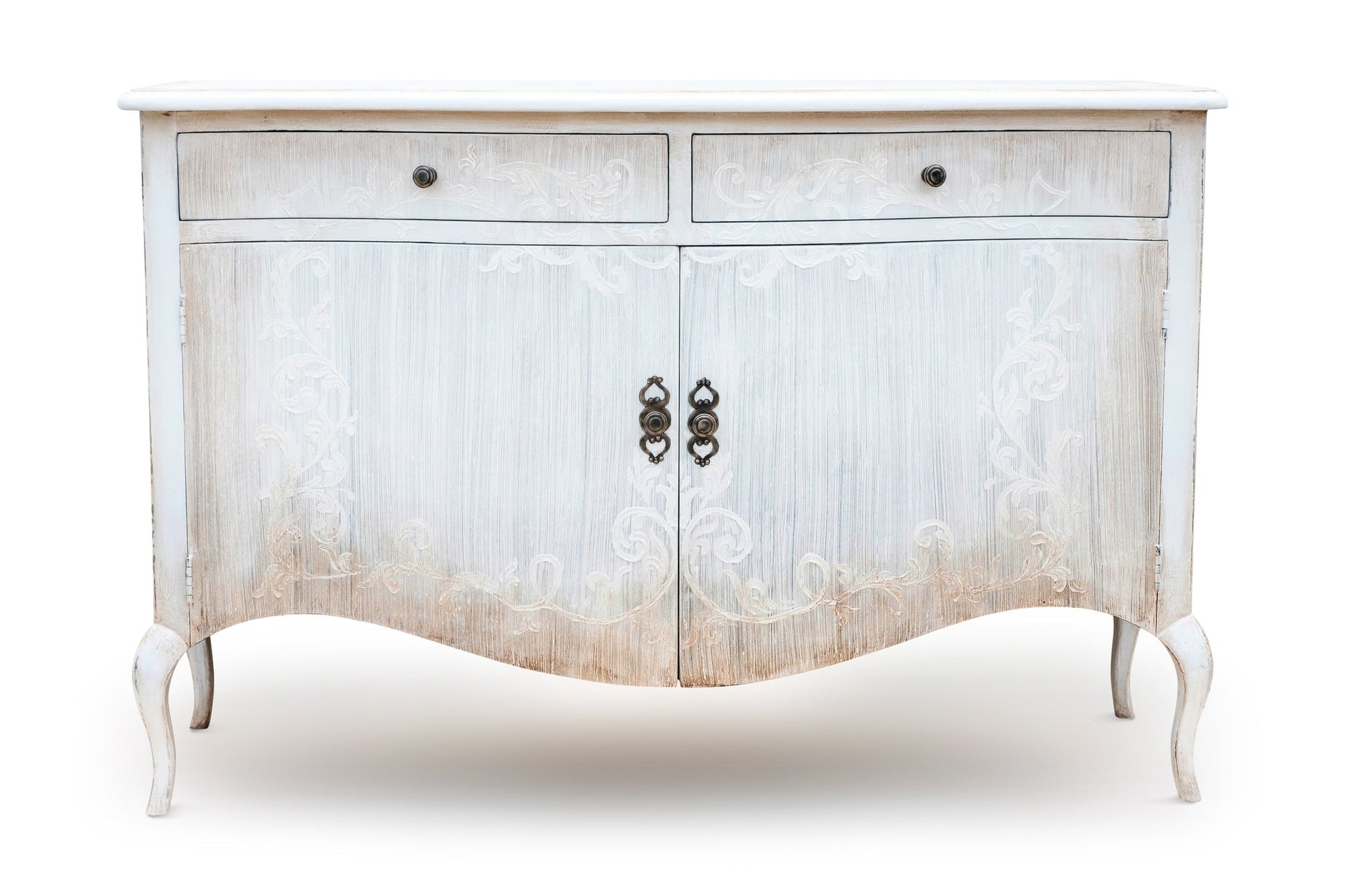The Arles Ivory Distressed French Provincial Buffet brings vintage elegance and practical storage to your dining room. Handmade with a weathered ivory finish, it complements traditional and rustic interiors alike while providing reliable surface and cabinet storage.