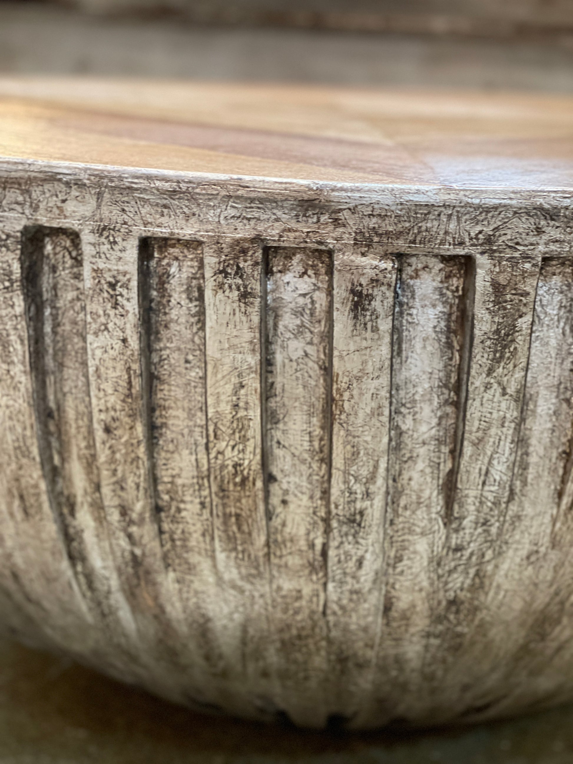 Cirq-Lapopie Coffee Table - Round, Weathered Gray, Ribbed Exterior Texture, Distressed Concrete Finish