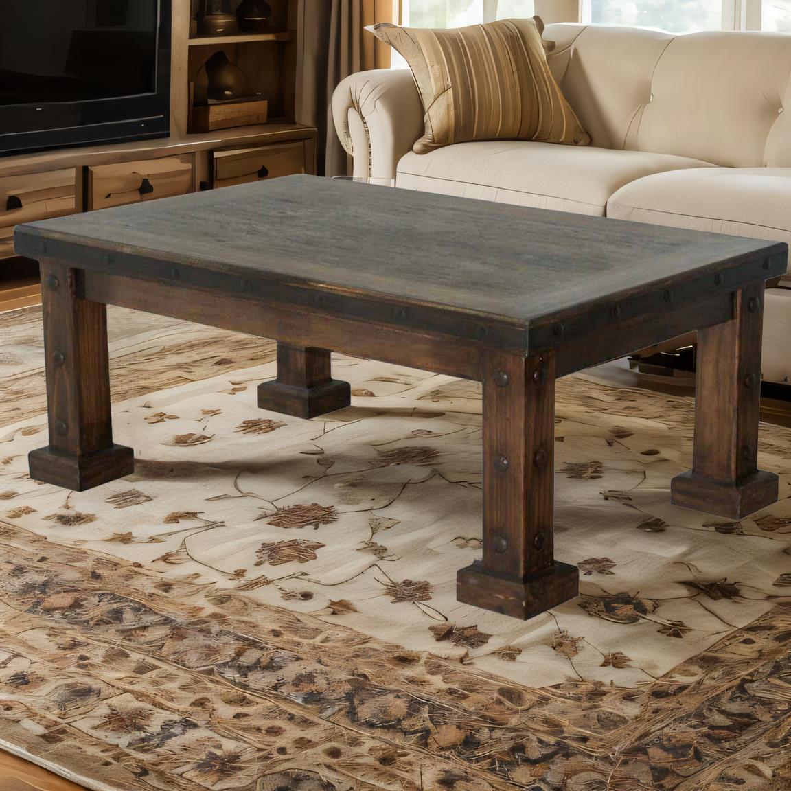 Bring rugged sophistication into your living space with the Whiskey River Rustic Coffee Table. Crafted from solid wood and finished with a distressed copper-toned top, this table embodies strength and style. Its robust legs, accented with exposed metal rivets, provide industrial charm and lasting durability. The rich, earthy tones and substantial silhouette make it a striking centerpiece for any rustic or lodge-style interior.