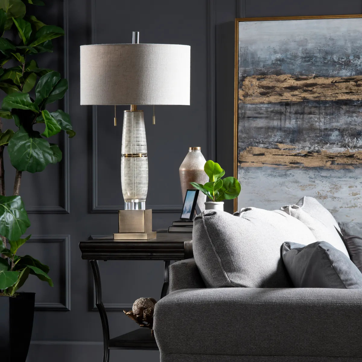 - Neutral fabric drum shade for a soft, diffused light