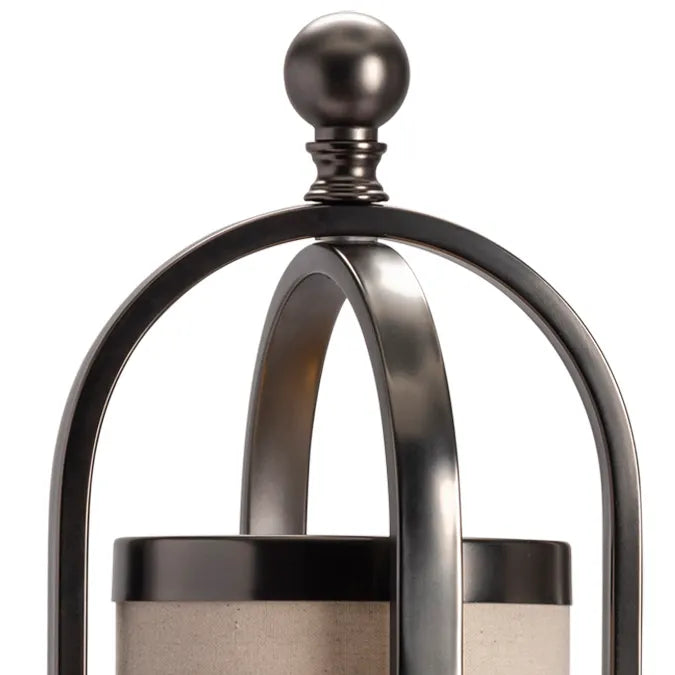 - Bronze finish with an open, cage-inspired frame surrounding a beige cylindrical shade