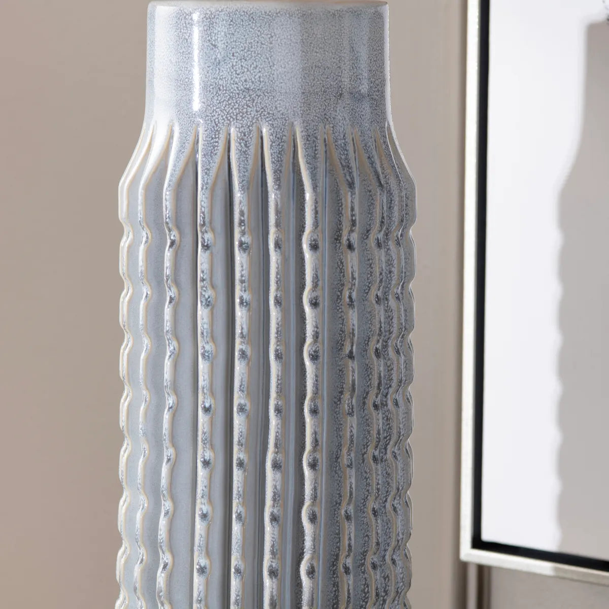 - Ceramic base with a vertical ribbed texture and soft glaze finish