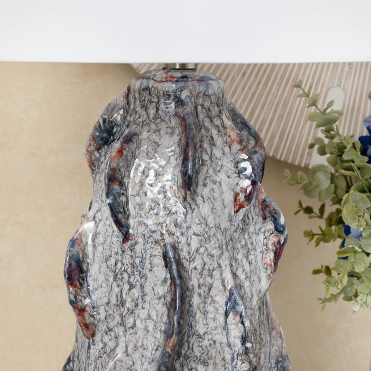 - Base features a textured ceramic silhouette in a cool blue-gray glaze, adding tactile interest and subtle color.