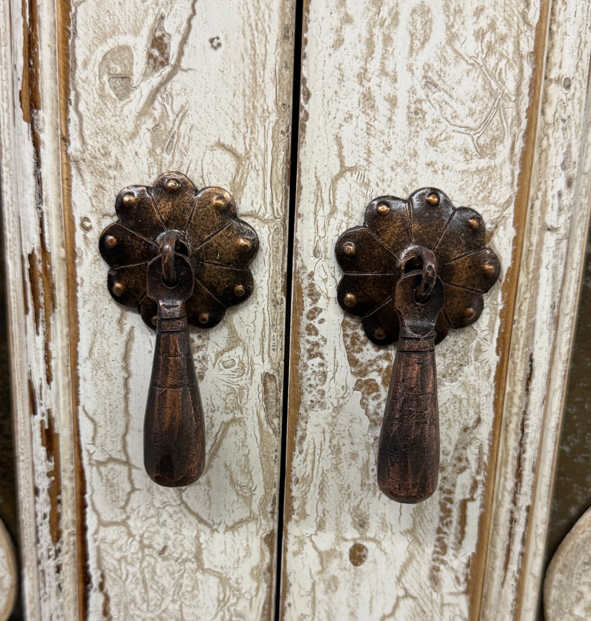 - Antique pewter hardware provides a vintage accent that pairs with a variety of styles.