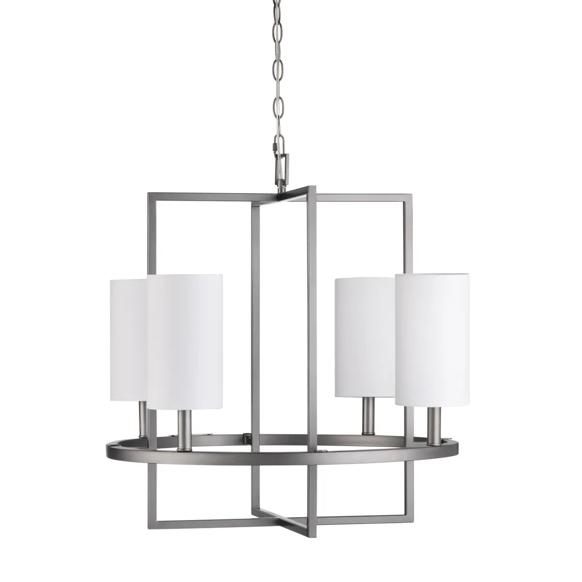 Dimensions: 23 x 23 x 24.75 (in). Crestview Collection's Fields 4 Light Chandelier is the epitome of modern-industrial elegance. This open metal, cage-style design is crafted in a satin gunmetal finish and includes four white linen lamp shades. Candelabra bulbs are required for illumination and mounting hardware is included. Allow this stunning pendant to be a statement piece in your home for years to come.