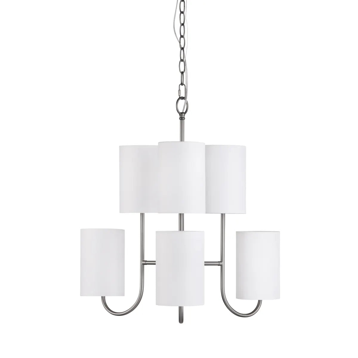 Dimensions: 20 x 20 x 22.5 (in). Crestview Collection's Fields 6 Light Chandelier is the epitome of modern-industrial elegance. This sleek metal design is crafted in a satin gunmetal finish and includes six white linen lamp shades. Candelabra bulbs are required for illumination and mounting hardware is included. Allow this stunning pendant to be a statement piece in your home for years to come.