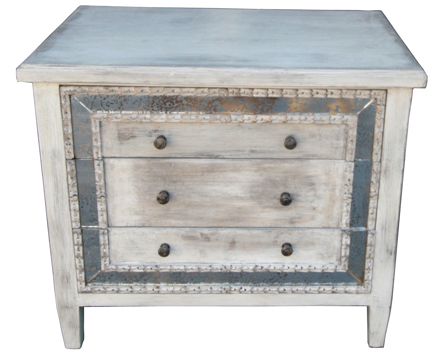Enhance your bedroom with a pair of nightstands that blend decorative detail with practical storage. The weathered finish and mirrored trim add a touch of elegance, while the drawers keep daily essentials neatly organized and accessible. The matching set makes it easy to create a cohesive, stylish bedside setup that works with a wide range of decor styles.
