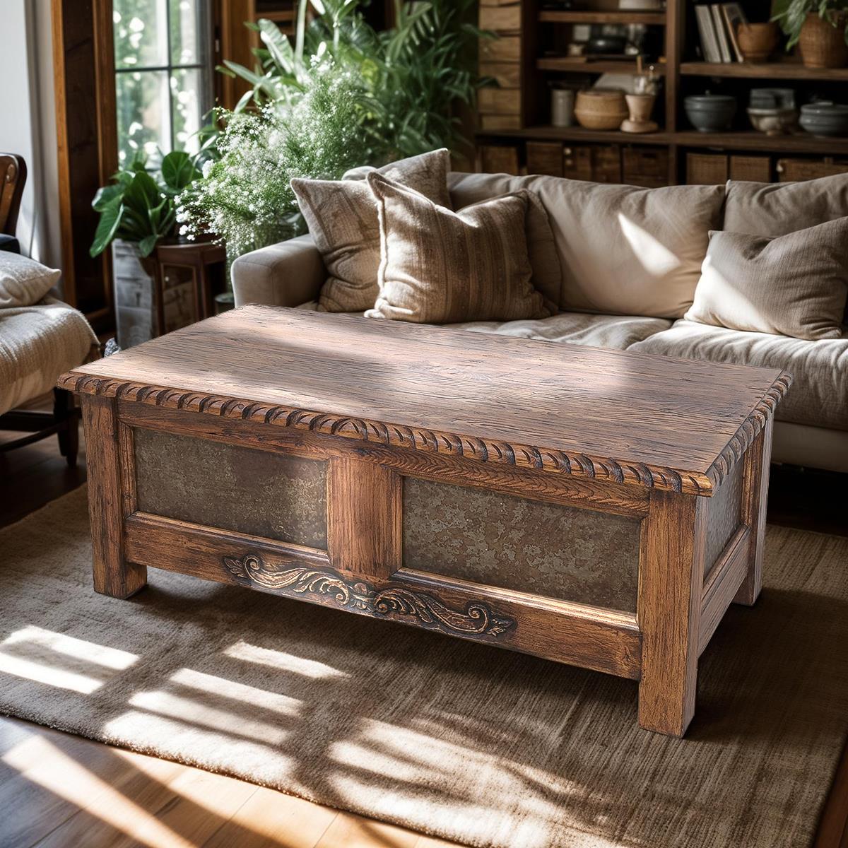 Bring timeless character to your living space with this artisan-crafted coffee table. Handcrafted from solid wood with a warm weathered finish, it features decorative metal panels and carved rope detailing for a touch of rustic elegance. The panel-front design and rich texture blend perfectly with farmhouse, Southwestern, or traditional interiors.