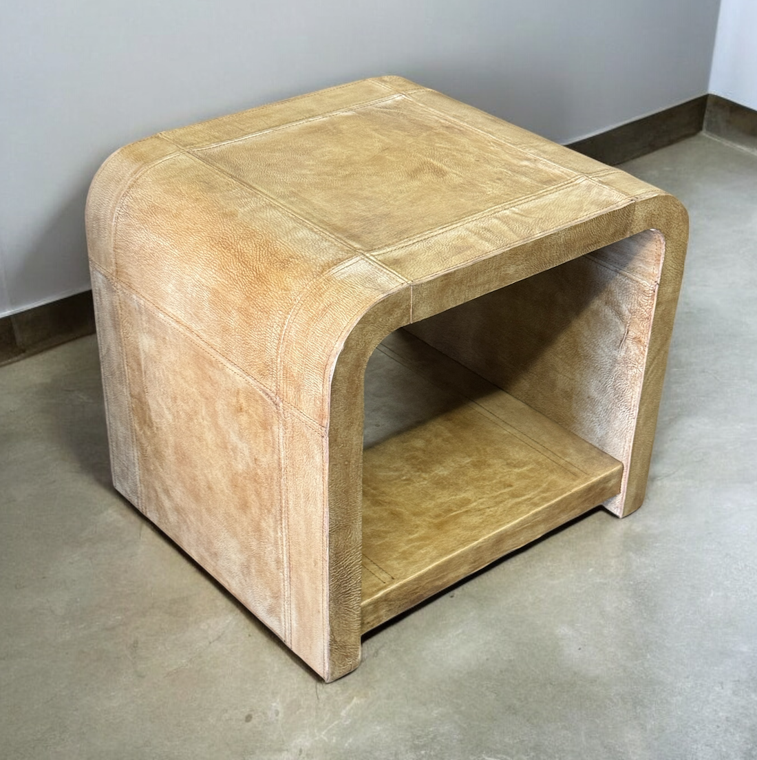 Meet the Les Vans End Tables (2-Pack): two compact tan faux-leather tables with a curved arch frame that bring modern style and practical surface space to your living room or bedroom. Their lower shelf adds extra storage or display, while the durable upholstery is easy to clean.